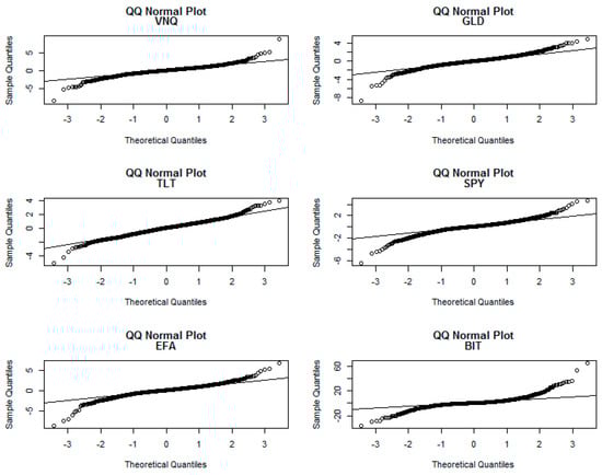 Summary statistics for daily returns indicate that, except for GLD, each series has a positive mean and median value (Table 1)5. BIT has the highest average return, while GLD has the lowest. Consistent with the findings of (), BIT has the highest standard deviation. The coefficient of variation, which is meaningful for positive values, shows that BIT has the least variation, while EFA has the most. Each series has skewness and kurtosis and rejects the null hypothesis of normality, indicating that distributions that take into account fat tails are likely to provide a better fit than a normal distribution. Unit root tests (not reported) indicate that each series is stationary. Correlation coefficients show that SPY, VNQ, and EFA correlate highly with each other (Table 2). TLT correlates negatively with VNQ, SPY, EFA, and BIT, but positively with GLD. Notice that BIT has very low correlation with the other assets, indicating the possible usefulness of bitcoin in diversifying risk. QQ plots show that each series has fat tails, which is common with asset price returns (Figure 2). In Figure 2, the black line is the theoretical quantiles and the circle line is the sample quantiles.