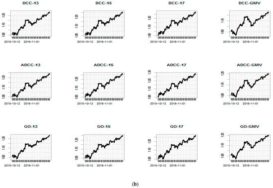 Equity curves are shown in Figure 3a,b. The bitcoin equity curves for target return portfolios look very similar. Notice that, as expected, portfolios calculated using a target return of 17% have larger final values then portfolios calculated using other target returns. Global minimum variance portfolios have larger drawdowns, which is consistent with the drawdown statistics in Table 4. A similar pattern is observed for the gold portfolio equity curves.
