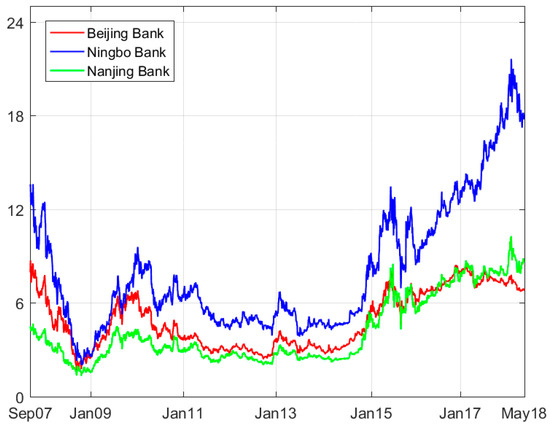Daily share prices of the Beijing Bank, Ningbo Bank, and Nanjing Bank from 19 September 2007 to 21 May 2018.