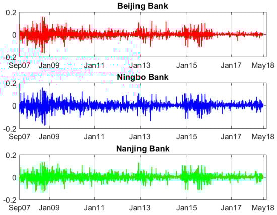 Daily returns of the Beijing Bank, Ningbo Bank, and Nanjing Bank from 19 September 2007 to 21 May 2018.