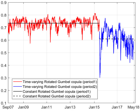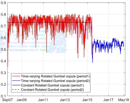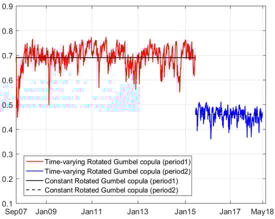For analyzing the time-varying dependence strength, we considered using the rotated Gumbel and Student’s t copula models with the generalized autoregressive score (GAS) model introduced by Creal et al. (2013). In this model, a parameter is denoted as the time-varying copula parameter. The score of the likelihood in the copula is written as . Specifically, in the rotated Gumbel copula model, the parameter can be defined as because the parameter should be larger than one. In the Student’s t copula model, the parameter can be defined as to obtain the dependence parameter between −1 and 1.