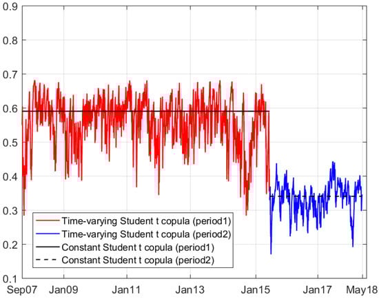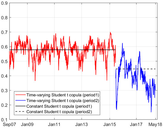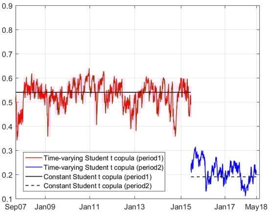 Time-varying and constant tail dependence in the Student’s t copula for Group 2 (Beijing Bank and Nanjing Bank). Period 1 ranges from 19 September 2007 to 4 June 2015 and period 2 ranges from 15 June 2015 to 21 May 2018.