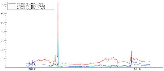 In this equation and below, we define the asset volatility as , where is the daily closing value of the nth asset in the system (e.g., in intra-cryptocurrency market connectedness n = 4) on day t.12