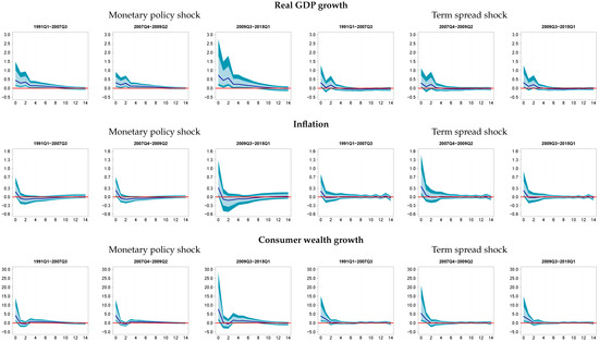 The top panel of Figure 2 lists results for real output growth: on the left-hand side in response to the conventional monetary policy shock and on the right-hand side in reaction to the term spread shock. Note that we have opted for slicing the time-varying impulse responses by fixing time periods of interest to show accompanying credible sets (50% in dark blue and 68% in light blue). These periods relate to the global financial crisis, namely the pre-crisis period (Q1 1991–Q3 2007), the crisis period (Q4 2007–Q2 2009) and its aftermath (Q3 2009–Q1 2015).13