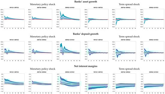 Next, we investigate the bank lending/credit channel. Figure 3 shows the responses of growth in assets and deposits of commercial banks, as well as net interest rate margins and Table 2 the corresponding forecast error variance decomposition.