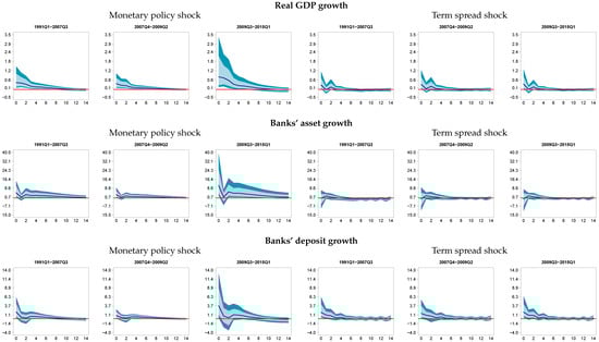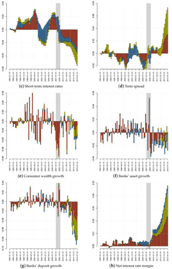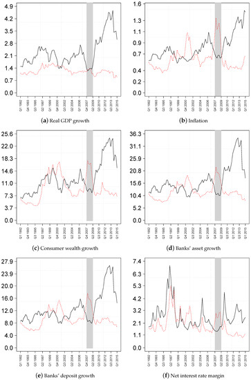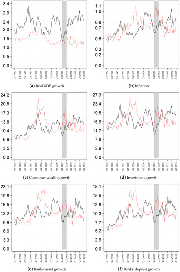 | 1. | Data on real GDP growth (GDPC96), CPI inflation (CPALTT01USQ661S), the effective federal funds rate (FEDFUNDS) calculated as the quarterly average of daily rates, 10-year-government bond yields to proxy long-term interest rates (IRLTLT01USQ156N), net worth of households and nonprofit organizations resembling consumer wealth (TNWBSHNO) deflated by the personal income deflator (PCECTPI) and net interest rate margins for large U.S. banks (USG15NIM) are from the Fred database, https://research.stlouisfed.org/fred2/. Data on commercial banks’ assets (FL764090005.Q, FL474090005.Q), deposits (FL763127005.Q, FL764110005.Q FL763131005.Q, FL763135005.Q, FL762150005.Q) are from the financial accounts database of the Federal Reserve System, https://www.federalreserve.gov/releases/z1/current/. By and large, all transformed data are stationary according to an augmented Dickey–Fuller test. |