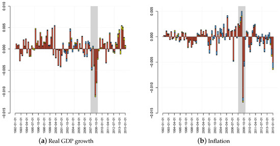 Historical decomposition of time series. Notes: Historical decomposition of time series based on the posterior median. The overall contribution of all shocks except the term spread and monetary policy shock in red. Contributions of the monetary policy shock and the term spread shock in blue and yellow, respectively. The shaded grey area indicates the period of the recession associated with the global financial crisis.