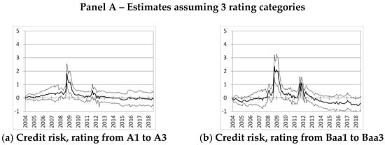 Credit risk premia are measured by δLR,t., which depend only on the difference in the default probabilities among the two rating categories defined in Section 2.3. Figure 5, panel A, plots the evolutions of the estimated credit risk premia, which are normalized at 0 at their beginning in January 2004.