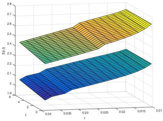 Figure 1 shows that the value of the bond price function in which the domain of the solution has been divided by free boundary surfaces into three regions: high, middle and low rating regions. From Figure 2, the value changes quite significantly across the free boundary surfaces. Since has an opposite tendency with , where , the free boundary is increasing as expected.