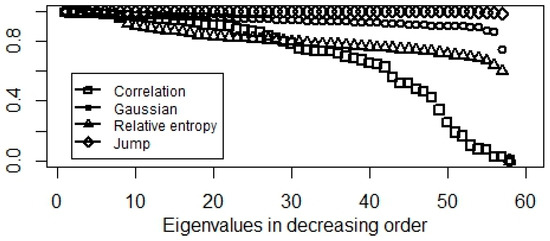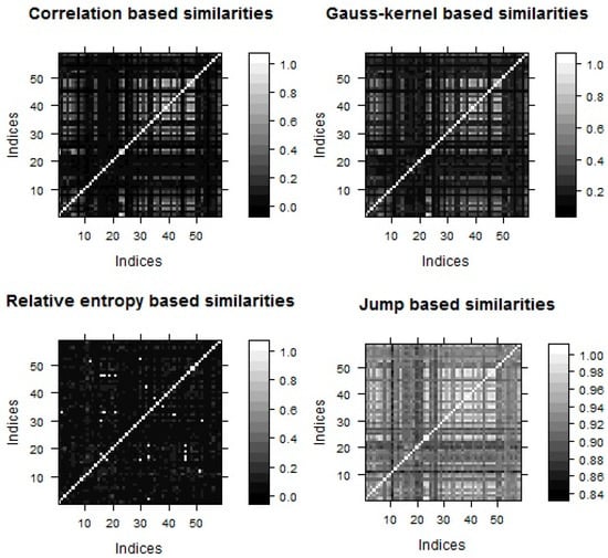 This study analyzes correlation, jump, entropy, and Gaussian-based similarity kernels. When calculating the similarity matrices, we expect strongly connected indices have coefficients close to one, whereas loosely connected close to zero. Level plots (Figure 1) give a feeling about the network structure which seems to be homogeneous; thus, clusters could not be well separated.