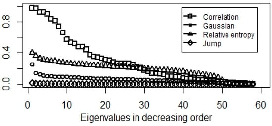 Investigating the spectra, especially the positions of spectral gaps, gives some guidance on the optimal number of clusters. Considering the previous results, the spectra of Gaussian and relative entropy-based normalized modularity matrices are suitable. Figure 4 shows indices could be put into 2, 3, or 5 clusters.