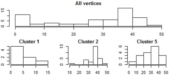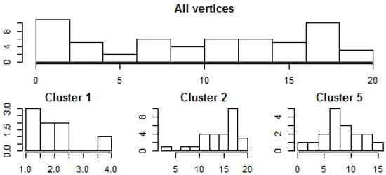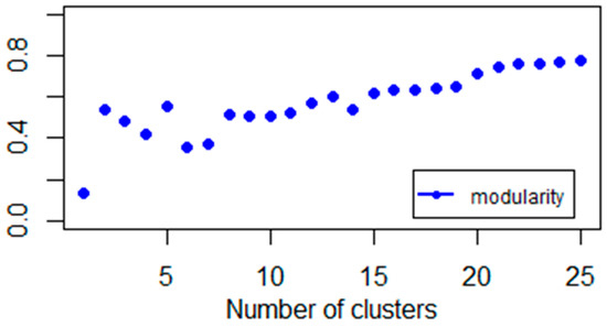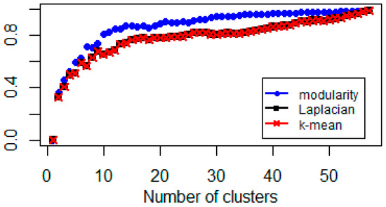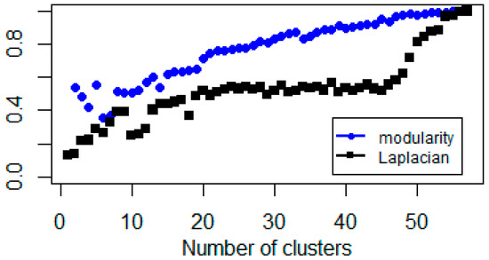 Notice that these results are in line with Figure 1 because the normalized Laplacian minimizes the normalized cut (Equation (10)), which in turn, is small if, and only if, the clusters are loosely connected. Whereas, the modularity approach maximizes the information of clustering, hence, it can also be used in a homogeneous network structure as well.