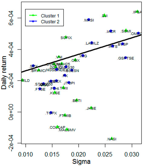 We have seen this naïve method does not give optimal cuts. However, if we calculate Gaussian similarities and normalized modularity matrix based representation, then we get clusters with a higher variance explanatory power. We have seen stock indices can be put into 2, 3, or 5 clusters. If we plot the mean-variance representation of indices we get Figure 9, Figure 10 and Figure 11, for 2 and 5 clusters, respectively.