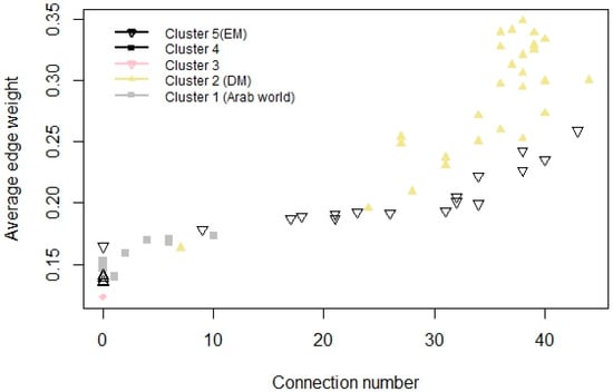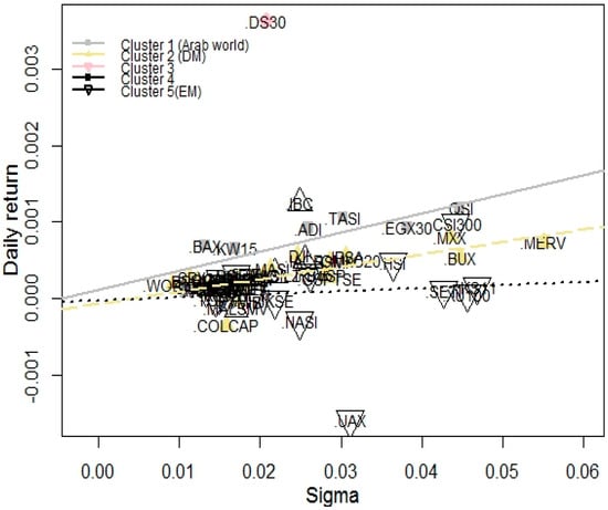 Spectral gap (Figure 4) and variance analyses (Figure 5 and Figure 7) imply equity indices can be studied by using 2, 3, and 5 clusters. The explanatory power of two clusters is 38%. This means roughly one-third of the total variance comes from the sample heterogeneity. If we increase the number of clusters and investigate the three cluster cases, we get a similar explanatory power. However, a spectral gap appears between the third and fourth eigenvalues (Figure 4), so, theoretically, we propose the three clusters. The next gap is between the fifth and sixth eigenvalues. The explanation power of five clusters is 52%. This means, half of the total variance of data can be explained by five clusters.