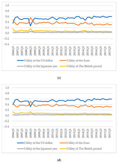 We use Equation (1) to calculate utility of international currency in each period. Figure 1a–d show time series of utility of four international currencies. Throughout a whole period, changes in utility of the US dollar, the euro, the Japanese yen and the British pound are fluctuating around 0.5, 0.35, 0.03 and 0.08, respectively.