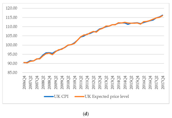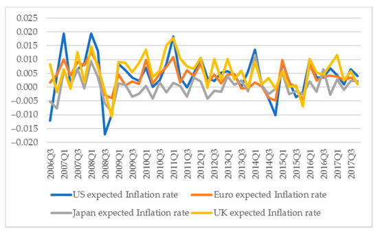 Inflation rate in the United States is relatively decreased compared with the other countries and region. At the Lehman Brothers bankruptcy in September 2008, housing price and rents in the United States sharp declined. Accordingly, CPI in the United States, which is greatly affected by housing price and rent, dropped in the period. Figure 2a–d show movements of CPI and expected price levels estimated from CPI. From the figures, from 2008Q3 to 2008Q4, the CPI of the United States is relatively lower than in other countries. Figure 3 shows movements of the four countries’ expected inflation rate. From this figure, the expected inflation rate in the United States made larger decrease than the others in 2008Q3.