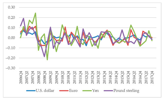 From Figure 6a, we can find that the US dollar liquidity shortage continues from 2006 to 2008. However, it has decreased to a level smaller than 0.1% since the FRB started quantitative easing monetary policy in late 2008 when it at the same time concluded and extended currency swap arrangements4 with other major central banks to provide US dollar liquidity to other countries. From Figure 6b, we can find that the euro liquidity shortage from 2006 to 2008 has not occurred except for the Lehman Brothers bankruptcy in September 2008. However, the liquidity risk premium in terms of the euro increased from June 2010 to June 2012. Figure 6c,d do not show any significant increases in liquidity risk premium in terms of the Japanese yen and the British pound during the analysis period. The stable movements in the liquidity risk premium in terms of these currencies are different those in terms of the US dollar and the euro.