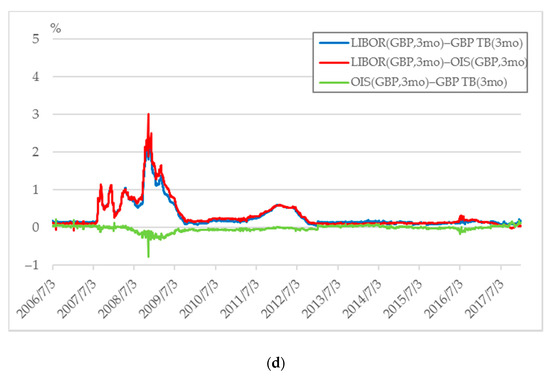 Figure 6a–d show movements in three spreads of London Interbank Offered Rate (LIBOR) (3 months) minus Treasury Bills (TB) rate (3 months), LIBOR (3 months) minus Overnight Indexed Swap (OIS) rate (3 months), and OIS rate (3 months) minus TB rate (3 months). The spread of LIBOR minus OIS rate is regarded as credit risk premium because LIBOR is the interest rate at which banks borrow unsecured funds from other banks. OIS rate is the interest rate at which banks borrow secured funds from other banks. Given that banks mainly face and liquidity risk as well as credit risk, the spread of OIS rate minus TB rate is regarded as liquidity risk premium. The data were obtained from Datastream.