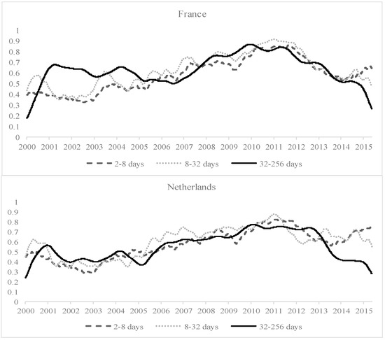 Table 6 indicates that all of the estimated ARCH and GARCH parameters (a, b), as well as the asymmetric coefficient (g) for the five countries’ raw ADCC models are highly significant. The estimated average dynamic conditional correlation between the real estate and stock markets is 0.5594 (Germany), 0.6011 (France), 0.6029 (Netherlands), 0.6717 (US) and 0.6879 (UK). However, these average results are not helpful for heterogeneous groups of investors, as the results suggest that not much diversification benefits are expected from investing in the two asset markets. This motivates the investigation of the time-scale cross-asset conditional correlations at the three investment horizons.