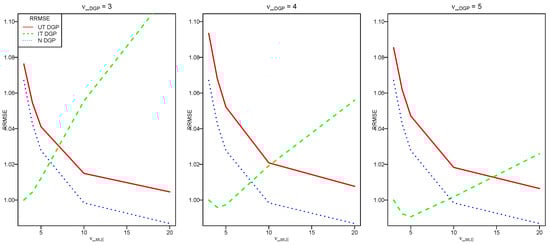 Figure 1 shows the performances in terms of RRMSE of the IT estimators under different DGP as a function of the degrees of freedom of the IT estimator (). The considered DGP are the Gaussian, UT, and IT DGP with the degrees of freedom (respectively, , ) on the left (respectively, middle, right) plot. Overall, the RRMSE of for the IT DGP has a down trend and then an up trend, while for the Gaussian and the UT DGP, the RRMSE are decreasing when increases. The maximum RRMSE of is around 1.09 under the UT DGP and is around 1.08 under the Gaussian DGP. It decreases then to one when increases to twenty under the Gaussian and the UT DGP; thus, the risk under misspecification is not very high. The curve is U-shaped under the IT DGP with a minimum when . The worst performance is when is small and is large. The RRMSE of with is similar than the one with .