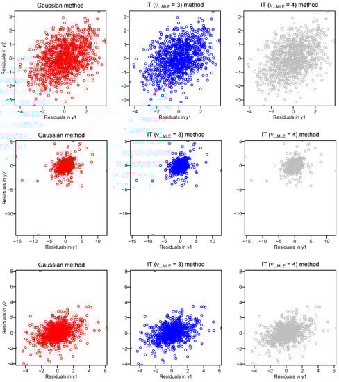 Toy data: scatterplots of residuals in the Gaussian DGP (respectively, the IT DGP with , the IT DGP with ) on the first row (respectively, the second row, the third row).
