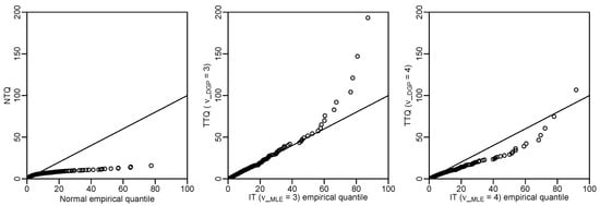 Figure 4 shows the Q-Q plots comparing the empirical quantiles of the Mahalanobis distances for the normal (respectively, the IT (), the IT ()) estimators on the horizontal axis to the theoretical quantiles of the Mahalanobis distances for the normal (respectively, the IT (), the IT ()) on the vertical axis for the financial data. These Q-Q plots are coherent with the results of the tests in Table 8. The IT model with three degrees of freedom fits our financial data well.