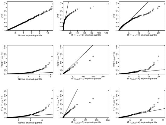 Figure 5 displays the Q-Q plots for the toy DGP: the Gaussian DGP in the first column, the IT DGP with in the second column, and the IT DGP with in the third column. The first row compares the empirical quantiles to the normal case quantiles, the second to the Student case quantiles with , and the third row to Student case quantiles with The Q-Q plots on the diagonal confirm that the fit is good when the model is correct. The other Q-Q plots outside the diagonal correctly reveal a clear deviation from the hypothesized model.