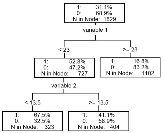 A decision tree is a tool mainly used in hierarchical segmentation (division) of the dataset. The main element is the so-called root that includes the entire dataset. Subsequent splits of the data (observations) are carried out in the so-called nodes, or segments, according to the rules created on the basis of the values of explanatory variables. A segment that is subdivided into subsegments is being referred to as the parent node (or intermediate node) and the subsegments as children nodes. The tree branch creates a node with further subsegments. A leaf (group) is the final segment that is no longer divided. Each observation from the output node is assigned to only one final leaf. The decision tree contains intermediate and final nodes, while the decision tree model contains only the final leaves that are used to predict or classify data (see Figure 1).
