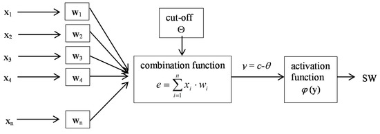 The neural network, i.e., the fourth analyzed method, is formed by the neurons (information processing elements) along with the connections among them (weights modified during the learning process). This network is a simplified model of the human brain. A neuron contains many inputs xi, where i = 1, 2, ..., n and one output. Neural inputs are selected by the explanatory variables. When neural networks are used to forecast the risk of bankruptcy, these are typically financial ratios. Each input variable is assigned a specific weight wi. Once the weights are determined, the total neuron activation (e) is calculated as the sum of the product of the explanatory variables and their weights assigned. Then y is calculated, which is the difference between the value of e and the threshold value Θ. The output signal depends on the neuron activation and the activation function φ(y). The form of this function determines the neuron type (see Figure 2).
