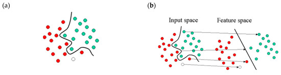 Support vector machines are based on the concept of decision planes that define decision boundaries. A decision plane is one that separates between a set of objects having different class memberships. The classic example of a separation is a linear classifier that separates a set of objects into their respective groups with a line. Most classification tasks, however, are not that simple, and often more complex structures are needed in order to make an optimal separation, i.e., to correctly classify new objects (test cases) on the basis of the examples that are available (train cases). This situation is depicted in the illustration below (Figure 3a). A full separation of the “green” and “red” objects would require a curve (which is more complex than a line). Classification tasks based on drawing separating lines to distinguish between objects of different class memberships are known as hyperplane classifiers. Support vector machines handle such tasks. The illustration below (Figure 3b) shows the basic idea behind support vector machines. The original objects (left side of the schematic) mapped, i.e., rearranged, using a set of mathematical functions, known as kernels. The process of rearranging the objects is known as mapping (transformation).
