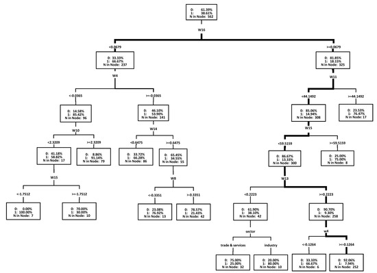 The first split was done according to ratio w16 into a group with almost a twice higher level of bankruptcy, w16 < 0.0679, and a group with almost twice lower level of bankruptcy, w16 ≥ 0.0679. Among those with w16 < 0.0679 there was a group with w4 < −0.0365 resulting in bankruptcy level 85.4% and further split according w10 < 2.32 giving the bankruptcy rate above 91% (more than 2.4 times higher comparing to total sample). The lowest risk of bankruptcy was characteristic for enterprises with w16 ≥ 0.0679, and w11 < 44.15 and w15 < 59.5 and w13 ≥ 0.22 and w4 ≥ −0.12. In this group the bankruptcy rate was about 7.9% (more than 4.75 times lower comparing to total sample).