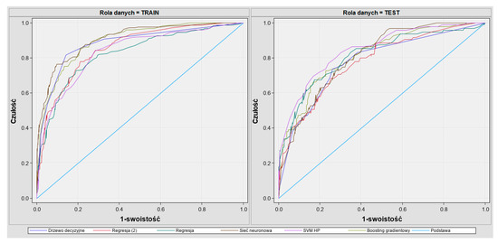 Model evaluation was based on the Gini (accuracy ratio—AR) coefficient on the test sample, which is a measure based on ROC, i.e., the curve used to measure the discriminative power of the model. It is applied in the case when the dependent variable is binary (it has two unique values). The Figure 6 presents the relation of the specificity to the sensitivity of the model. Both of those measures provide information on how effective the classification is in the context of both levels of the dependent variable. The ROC curve is a sensitivity function (on the vertical axis) and 1-specificity (on the horizontal axis). Each point of the curve corresponds to a given point of split (section). Points in the right upper corner correspond to a low q level. Points in the left bottom corner relate to a high q level. ROC does not depend on the assumed point of split. The rates are drawn for all points of split. While selecting a given point of split we can establish the specificity and sensitivity of the model for that point. Selecting a given point of split we can establish the number of successes and failures predicted by the model, and then calculate the sensitivity and the specificity of the model. The correspondent sensitivity and specificity levels are easy to read from the graph of the ROC curve. A good model has the ROC curve close to the upper-left boundary of the graph. Then we can find points on the curve representing high values both in terms of sensitivity and specificity (e.g., so that c > 0.8 and s > 0.8). The random model has the ROC curve lying on the diagonal. Then the sensitivity + specificity = 1 for all the threshold values of q. In such a case while establishing the value c > 0.8 we cannot ensure that the specificity is greater than 0.2. The ROC curve is helpful when selecting the optimal point of division. For example, we choose the threshold that gives equal probability of misclassification in each class. We also have to take into account the different cost of both types of misclassification and decide whether to provide high sensitivity or high specificity. The area under the ROC curve is a measure of the quality of the model. This way we can compare the quality of different models. The AUC (area under the ROC curve) for an ideal model equals 1 and for a random model 0.5.