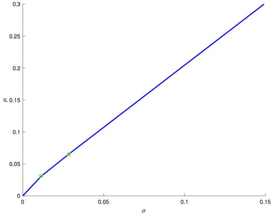, where the efficient frontier of the leveraged portfolio is a straight line since we are in the first case of Equation (