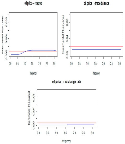 The frequency domain causality is carried out after ensuring the stationarity of the variables to investigate the causal effects of oil price on reserve, trade balance, and exchange rate in Nigeria. The short term causality is assumed to be periodicities (frequency) less than 1.5, while the periodicity of 1.5 is the intermediate term and the long term causality is the frequency greater than 1.5. In this study, Equation (5) is estimated separately with oil price as exogenous variable to reserve, trade balance, and exchange rate. This is so modeled because oil price is exogenous to Nigeria’s economy. The global oil prices are dictated by the economic conditions in the international market which are external to the sample country’s economy. As a result, we perform separate Granger causality tests for on . In the model; stands for oil price; while represents reserve, trade balance, and exchange rate. The results of the granger causality tests are presented in Figure 1. The first figure shows that oil price granger causes reserve in Nigeria at 0.001 incremental -squared, that is, 0.001% critical value with a frequency of value of 1.0. The 0.001 incremental -squared can be interpreted to mean that there is 99.999% confidence level of causality between oil price and reserve in Nigeria. This means that oil price strongly determines the level of reserve in Nigeria in the short term with the 1.0 frequency value. The periodicity is calculated by where is the year of periodicity, is 3.1416 and is 1.0 in this case. From the calculation, the periodicity is 18 months, equivalent to 1 year and 6 months. This implies that oil price usually has significant impact on reserves at every 1 year and 6 months and that the occurrence of causality is at every short period. The previous presence of cointegration between oil price and foreign reserve confirms the existence of frequency Granger causality between the two variables. Our result of short-term frequency causality from oil to reserve is in line with a previous study done by Yanfeng (2013) for Japanese, where oil prices was found to have causal effects on the Japanese economy at short term frequency. Our findings of short term causal relationship between oil price and reserve is consistent with Nigeria’s experience. Higher oil price has always been associated with higher reserve while low oil price is linked to low reserve. For example, in 2008, oil price was around US$103 and Nigeria’s reserve hit about US$60 billion. In the same vein, reserve fell to US$23 billion with a fall in oil price to US$37 in 2015. On the other hand, causality is not found from oil price to trade balance. The absence of cointegration between oil price and trade balance corroborates the result for the frequency granger causality test. The outcome of the causality may be as a result of recent increase in non-oil export, such as solid minerals, agricultural products, and manufactured exports. The recent exported agricultural products are cashew nuts, sesame, shrimps, soya beans, ginger, cocoa. Although oil still dominates exports in Nigeria, yet government is making concerted effort towards diversifying the economy away from oil as laid down in the Nigerian Economic Recovery and Growth Plan (NERGP) on zero oil agenda. The result of no causal relationship from oil price to trade balance supports a previous study carried out on US and nine EU countries by Huang et al. (2018) that also found no causal effects from oil price to tourism-related economic activities. Lastly, causality is also not found from oil price to exchange rate. The cointegration result is also in line with the granger causality result. The frequent use of foreign exchange to stabilize the exchange rate level by the central bank of Nigeria (CBN) periodically may explain the absence of causal effects of oil price on the exchange rate. Nigeria practices a managed floated exchange rate system. Such exchange rate policy intervention can greatly eliminate the effects of oil price on the exchange rate. Our findings supported a previous study conducted by Habib and Kalamova (2007) for Russia, Norway, and Saudi Arabia that no significant causal relationship exists between oil price and exchange rate for the oil rich countries. It is also in support of a more recent paper by Bayat et al. (2015) that oil price does not have causal effect on exchange rate in Hungary with frequency domain analysis.