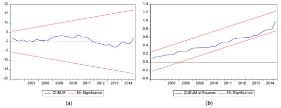 Finally, the stability of the long-run coefficients along with the short run dynamics are evaluated by applying the CUSUM and CUSUMSQ (Brown et al. 1975). The CUSUM test uses the cumulative sum of recursive residuals, whereas the CUSUMSQ test is based on the cumulative sum of the squared recursive residuals. As shown in Figure 2 both plots of CUSUM statistics and CUSUMSQ statistics stay within the critical bounds of the 5% significance level (represented by the pair of straight lines drawn at the 5% level of significance). These tests indicate no evidence of any significant structural instability. Therefore, the estimated results are stable over the studied time period.