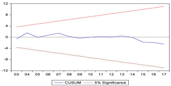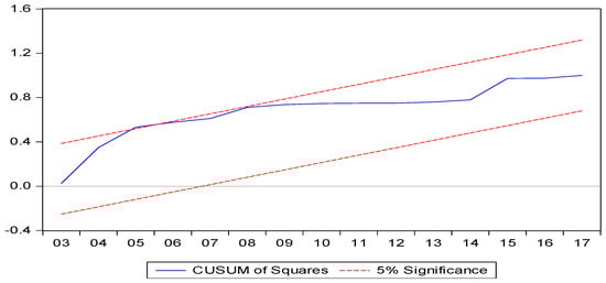 The F-statistic and critical value are the base on which we accepted and rejected the hypothesis. We used (), who proposed critical values, to make any conclusion about the cointegration. It indicates the existence of a long-term association among the variables if the F-statistic value is higher than the upper bounds of the critical value. Furthermore, the model passed through the diagnostic test CUSUM and the CUSUMSQ test.