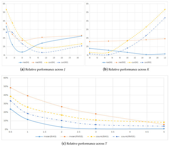 When comparing the two methods, it is noteworthy, though, that in all cases, the absolute bias and the RMSE is lowest with the symmetric method, and this method consistently outperforms the regular method across all choices of N, as can be seen from Figure 3a. When it comes to the number of times the symmetric method has lower errors, a pattern very similar to what was seen when increasing T or is found.