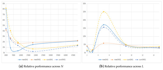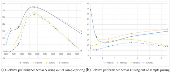 When comparing the two methods, the table shows that the symmetric method almost always provides estimates with smaller errors than does the regular method across the choice of L. The exception to this is when using and looking at the average bias, where the absolute value from using the regular method is half that of using the symmetric method. When it comes to the number of times the symmetric method has lower errors, a pattern very similar to what was observed previously is found. The main difference is that, for the first configuration of all the ones considered up to this point, a case occurs where the regular method on average provides estimates that are better in terms of the RMSE. Unsurprisingly, this happens when for which of the estimated regular prices have smaller errors.