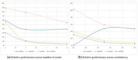 Figure 5a and Panel A of Table 6 show the results across the number of assets, M, and demonstrate clearly that our suggestion of pricing call options as put options becomes more important as the dimension, and hence the computational complexity, of the option increases. In particular, the relative error of the symmetric method in terms of RMSE in Figure 5a goes from – as the dimension increases from 2–5. Moreover, when the dimension of the problem is high, the symmetric method almost always, in of the cases, has the lowest RMSE, as shown in Panel A of Table 6.