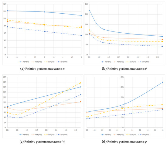 In terms of performance across parameters, Figure 6 and Table 7 show that the symmetric method performs relatively better the faster the volatility mean reverts, i.e., the larger the value of in Figure 6a, and the larger the value of the long-term variance, i.e., the larger the value of in Figure 6b. The last of these findings is completely in line with the results from our benchmark model where symmetric pricing was most important for high values of the asset volatility. Figure 6d shows that the symmetric method performs relatively better when correlations are negative, which is indeed the empirically most relevant case in the stochastic volatility model of Heston (1993). When the correlation is highly negative and , the symmetric method has errors in terms of bias and RMSE that are around lower than the regular method and has the largest errors for only around one third of the individual options. The effect on the relative performance of the initial variance, , is less clear cut though Figure 6c does indicate that the symmetric method performs relatively better when is not too extreme, and in particular not too high.