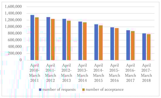 Number of requests by small and medium-sized enterprises (SMEs) and acceptance by banks. This figure shows the number of requests by SMEs to restructure their loans and the number of those that were accepted by banks during each fiscal year. Source: Financial Services Agency of Japan (2018).