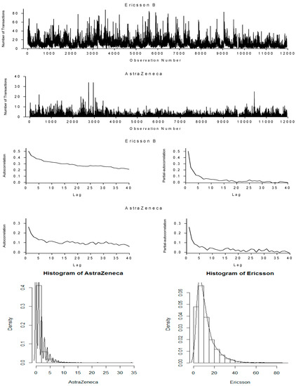 In this paper, we use the same data set used by Quoreshi (2014). The reason for this is that we introduce Quasi-Maximum Likelihood Method, which has not been considered in the study and the studies on count data earlier due to unknown underlying distribution. We intend to employ this method on the same data set and replicate the previous study to compare with results emerged from employing this method. Quoreshi (2014) has downloaded the tick-by-tick data for Ericsson B and AstraZeneca from the Ecovision system and the data are later filtered to generate transaction data which are counts. The stocks are frequently traded and have the highest turnovers at the Stockholmsbörsen. The two stock series are collected for the period 5 November–12 December 2002. Due to a technical problem in downloading data there are no data for 12 November in the time series and the first captured minutes of 5 December is 1037. Since we are interested in capturing the number of ordinary transactions, we have deleted all trading before 0935 (trading opens at 0930) and after 1714 (order book closes at 1720). The transactions in the first few minutes are subject to a different trading mechanism while there is practically no trading after 1714. The data are aggregated into one minute intervals of time. For high frequency data, researchers usually use one, two, five, or ten minute intervals of time and the choice is rather arbitrary. There are altogether 11,960 observations for both the Ericsson B and AstraZeneca series. The series together with their autocorrelation and partial-autocorrelation functions and histograms are exhibited in Figure 1. There are frequent zero frequencies in both series, especially in the AstraZeneca series, and hence the application of count data modeling is called for. The counts in both series fluctuate around their means which is an indication of mean reverting processes. The autocorrelation functions for both series suggest fractional integration which implies long memory. The histograms exhibit the distribution of counts and the possible empirical densities of the counts. Even with relatively large sample size, the distributions appear far from being normally distributed. On the other hand, the distributions appear to be similar to Poisson distribution; both variances are greater than their respective means (Figure 1). Hence, there is no scope for employing known distributions.