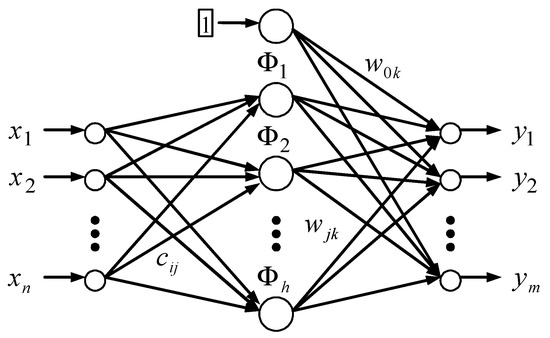 Besides the input branching layer, RBF networks have two more layers of neurons—the hidden and output one. Those are characterized by a forward signal dissemination and learning with a teacher, while the learning speed is their great advantage. The RBF networks are used mainly for equalizing, approximating, and interpolating less structured problems with dispersed data. Graph representation of the network can be seen in Figure 3.