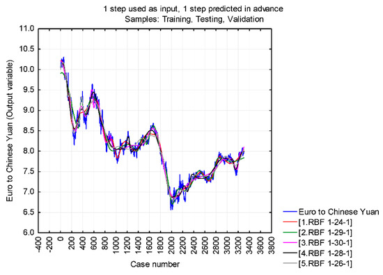 All the generated and retained artificial neural networks were able to equalize the examined time series—Euro to Yuan exchange rate. Even the comparison of the correlation coefficients (see Table 3 and Table 7) clearly shows a higher performance of the B alternative, that is, the MLP neural networks (when including additional categorical variables). This is also reflected in assessing the basic predictions statistics of the equalized time series (see Table 4 and Table 8). The retained MLP networks, or their equalized time series, show smaller mutual differences in training, testing, and validation data sets than in the case of the RBF networks (without additional variable). This can be seen in Figure 4, Figure 5, Figure 6, Figure 7, Figure 8, Figure 9 and Figure 10. At first sight, it is clear that only the MLP networks of the B alternative are capable of capturing the actual time series course (for more details, see Figure 10).