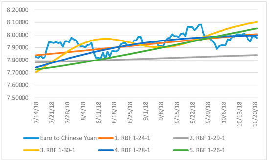 These are only radial basis neural networks. The hidden layer contains only one variable—time. The hidden layers of the neural networks contain between 24 and 30 neurons. The output layer logically contains only one neuron and one output variable—the Euro to Yuan exchange rate. For all three networks, training algorithm RBFT was applied. For the activation of the hidden layer, all neural structures used the identical function, Gaussian function. Similarly, for the activation of the output layer of neurons, the same function (Identity) is used. For more details, see Table 2.