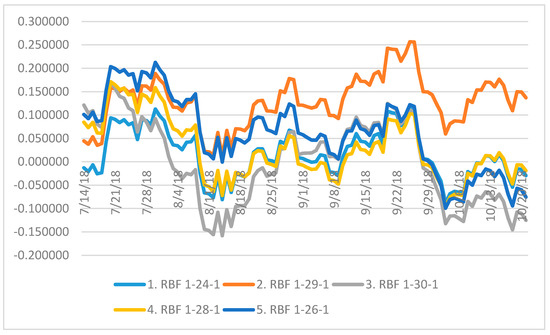 It results from the graph that in the monitored period, the sum of the residuals approaching zero appears at all neural networks except for 2. RBF 1-29-1. In this case, all residuals achieve relatively high values. To illustrate the situation, Table 5 shows the sum of the residuals of all equalized time series.
