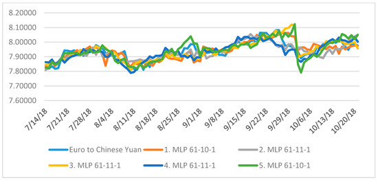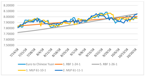 Line graph—comparison of retained neural networks in equalizing time series of development of Euro to Yuan exchange rate between 14th July and 21st October 2018. (Source: Own processing.)