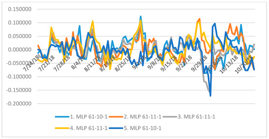 The graph shows that all neural networks can imitate the exchange rate of Euro to Yuan quite well. The deviation in the individual interval sections is 0.05 Yuan at most. Bigger differences were detected only on 25th September 2018, 1st October 2018, and 2nd October 2018; however, even on these days, the differences are not bigger than 0.1 Yuan. Based on the graph comparison, it can be stated that all the retained neural networks are applicable for the prediction. Therefore, examining residuals appears to be interesting. The development of the residuals between 14th July and 21st October 2018 is seen in Figure 9.