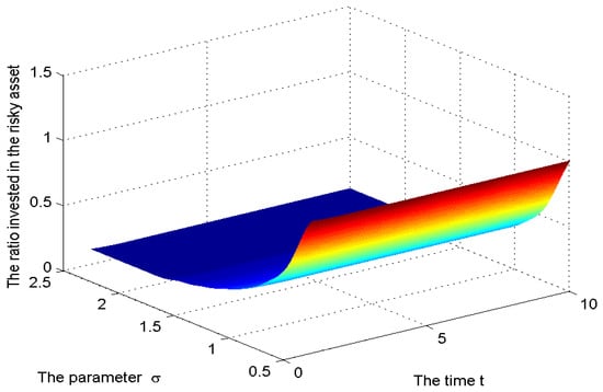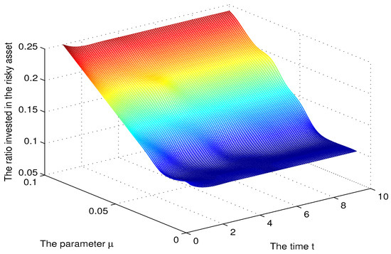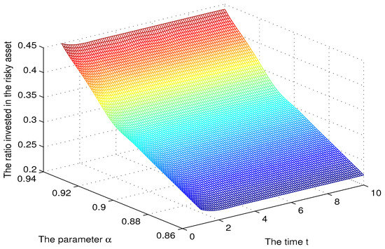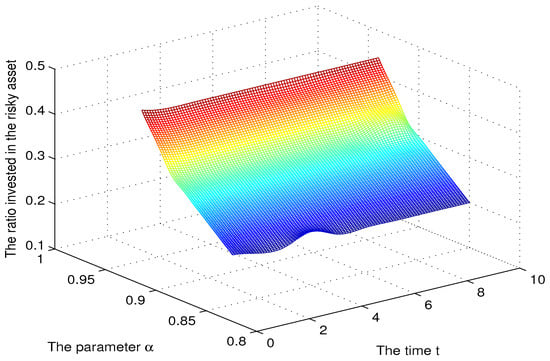 As expected, the investment in the risky asset was decreasing in since a higher makes the risky asset a less attractive investment opportunity. The effect of on the ratio invested in the risky asset is more pronounced for higher values of a fact explained by the CPT agent being conservative. The investment in the risky asset was increasing in and this is justified since a higher makes the risky asset more attractive. We see from Figure 4 that as increased from 5–, the ratio increased from 10–