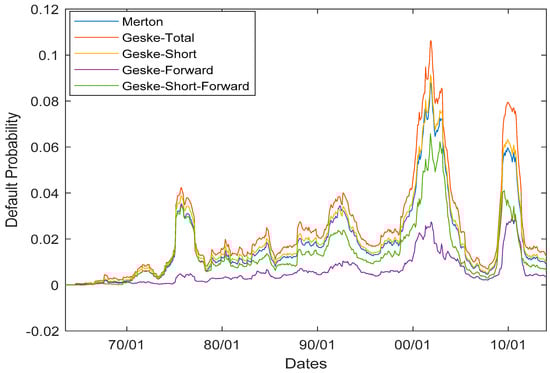 The Merton default probability is very highly correlated to Geske’s total default probability (0.96) and to Geske’s short-term default probability (1.00), but its correlation coefficient with Geske’s forward default probability is 0.58. It is positively correlated to “short-forward” default probability (0.77). The average values of all five default probabilities are plotted in Figure 1.
